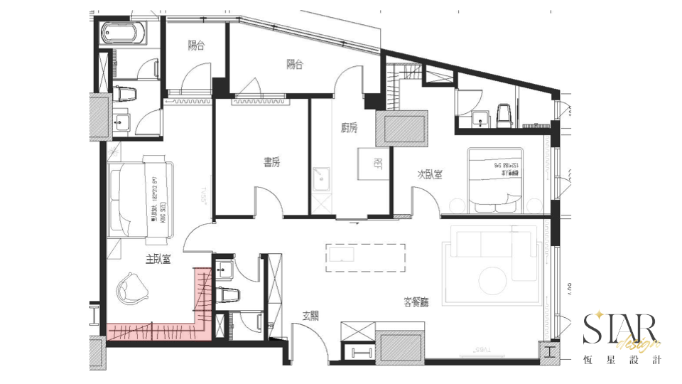 而在儲藏室的部分(圖中長方形色塊)則做了弧形的木作隱藏門設計,弧形木作設計也與L型收納櫃體相呼應,隱藏門使用可橫向移動的推拉門,藉由滑軌移動減少空間的佔用。