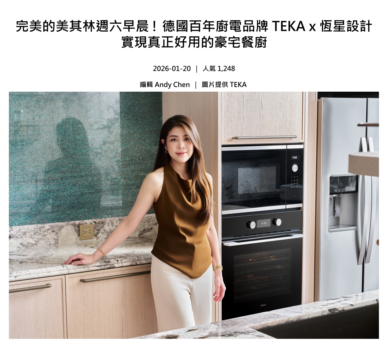 在追求美感與機能共存的高端住宅中,廚房早已超越料理本身,而成為承載家庭互動、生活質地與儀式感的核心空間,恆星設計總監鄧湘盈擅長以簡奢美學和精準比例感,打造優雅細膩的室內風格。 本案作為一家四口的家,設計師以 TEKA 德國百年進口廚電,包含 60cm 舒肥蒸烤箱、FullFlex 四口 IH 感應爐,為空間注入專業級烹飪性能,讓料理與空間設計達到更高層次的整合。TEKA 進口廚電很符合恆星設計追求的低調奢華美感,並提升設計師在家料理的便利性,是現代住宅最理想的廚電系列。 從自身下廚頻率出發,她更在意空間本質 本案總坪數約百坪,在四房兩廳的格局中,廚房和餐廳被視為一家四口最常聚集相處的地方。此宅的室內設計並非為了炫技,而是為了迎接週六早上的生活時光:全家人一起準備早餐、小孩在吧台旁幫忙,料理與互動同時發生。 鄧總監坦言自己生活忙碌,並非天天下廚的人,但正因如此,她更在意廚房是否是一個「讓人想走進來」的空間。她的日常料理型態以輕食、煲湯為主,週末會跟孩子一起做早餐,偶爾朋友來訪才會進行較高火力的家常料理。這樣的使用狀態,直接影響到她對廚電「多功能而不複雜」的期待,她不希望為了不同料理而堆疊過多設備,而是一機多用、直覺操作。►TEKA 60cm 舒肥蒸烤箱整合蒸、烤與低溫料理功能,一機多用,讓豪宅廚房能維持俐落的立面比例。