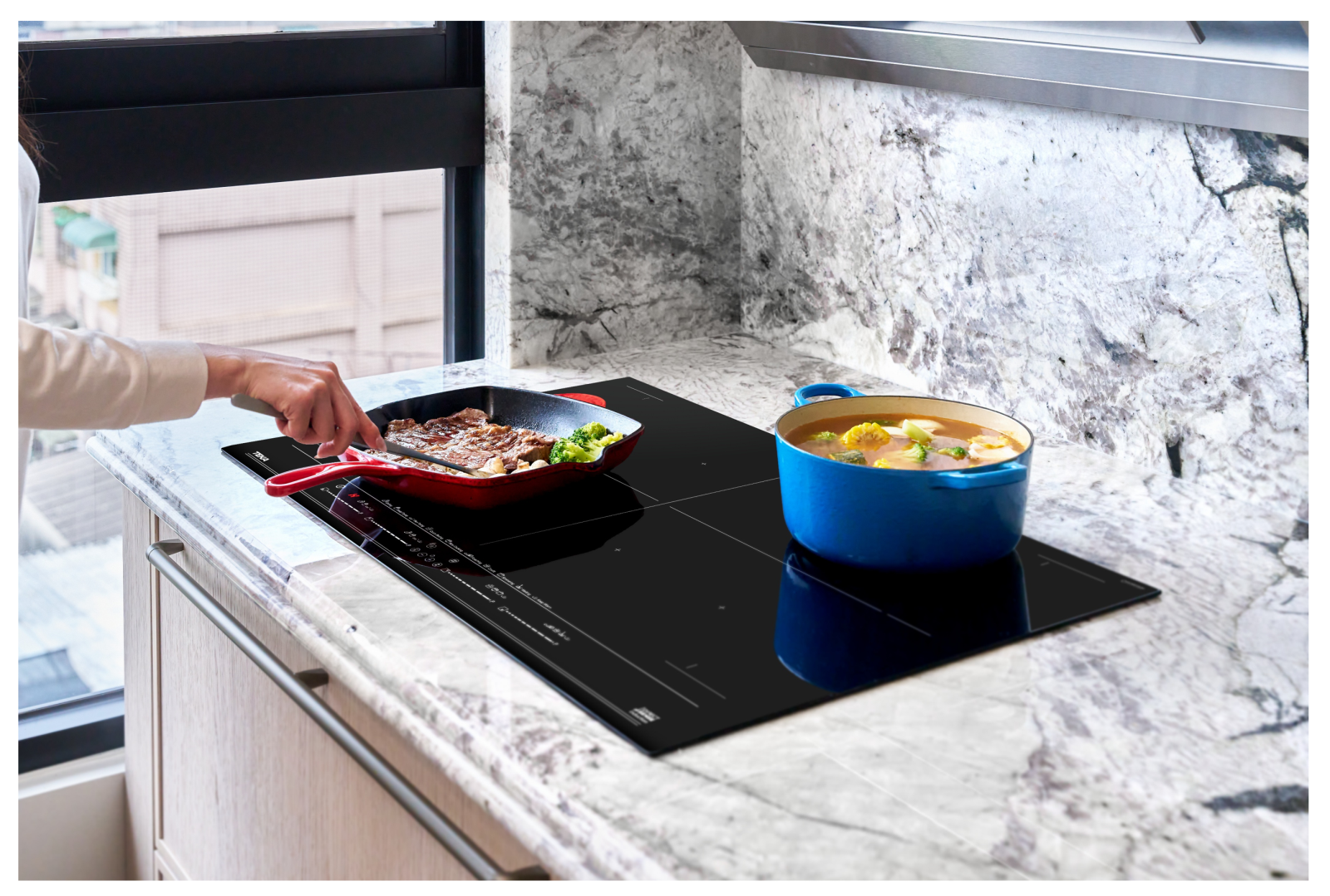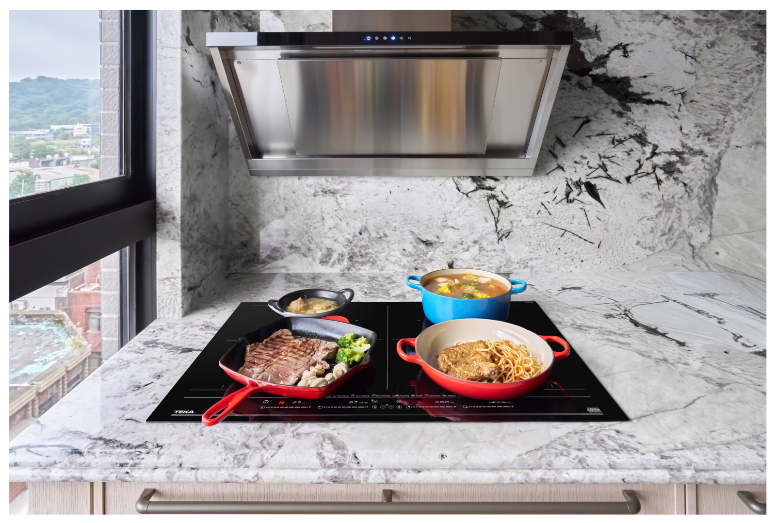 FullFlex 四口 IH 感應爐的 10 種大廚功能涵蓋爆炒、快煮、油封、燉煮等需求,搭配滑動觸控、Stop&Go 暫停、防溢與鍋具偵測等安全機制,在流暢操作的同時,也讓有孩子的家庭使用起來更安心。除此之外,全平面黑玻陶瓷面板則維持視覺簡潔,跟石材檯面自然銜接,呼應整體設計風格。 ►TEKA FullFlex 四口 IH 感應爐具備全區橋接加熱設計,鍋具不受固定區域限制,能同時應對多道料理,提升豪宅廚房的使用彈性。