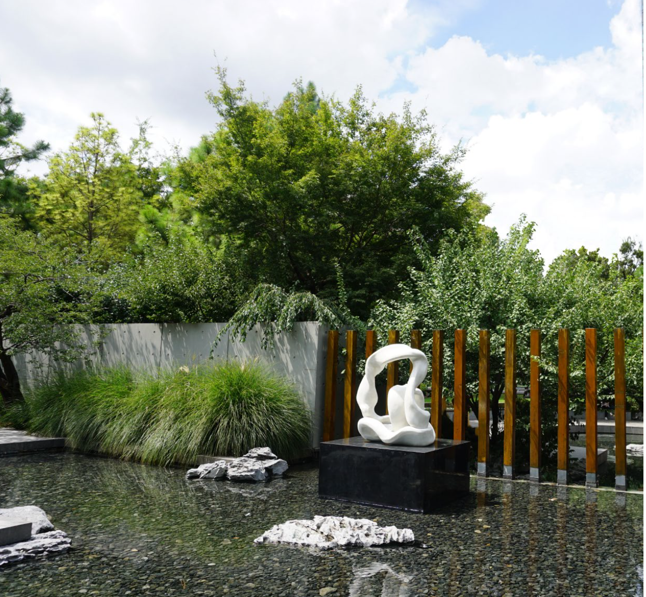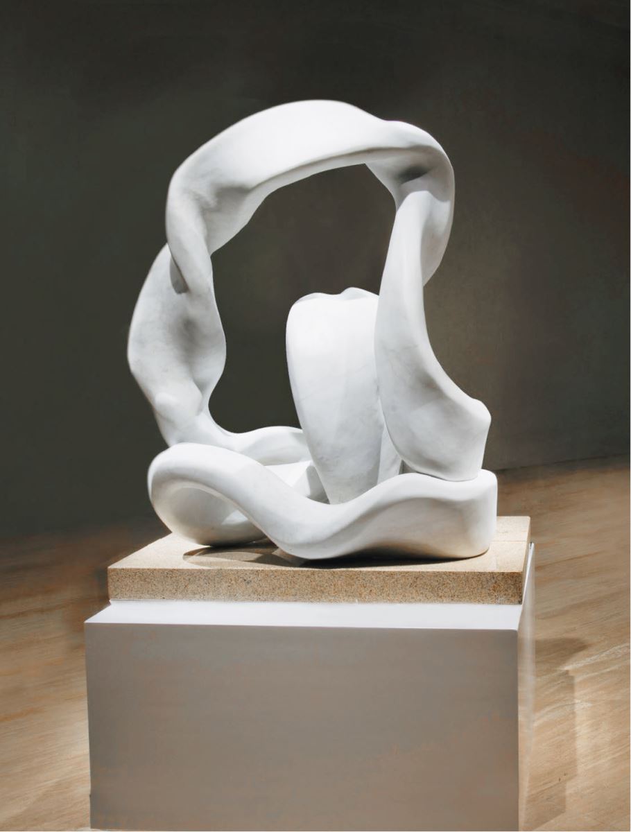 由八大畫廊代理的台灣藝術家許東榮,用溫潤的漢白玉石雕展現蜿蜒優雅的線條,是與公共空間、藍天綠樹的完美融合。